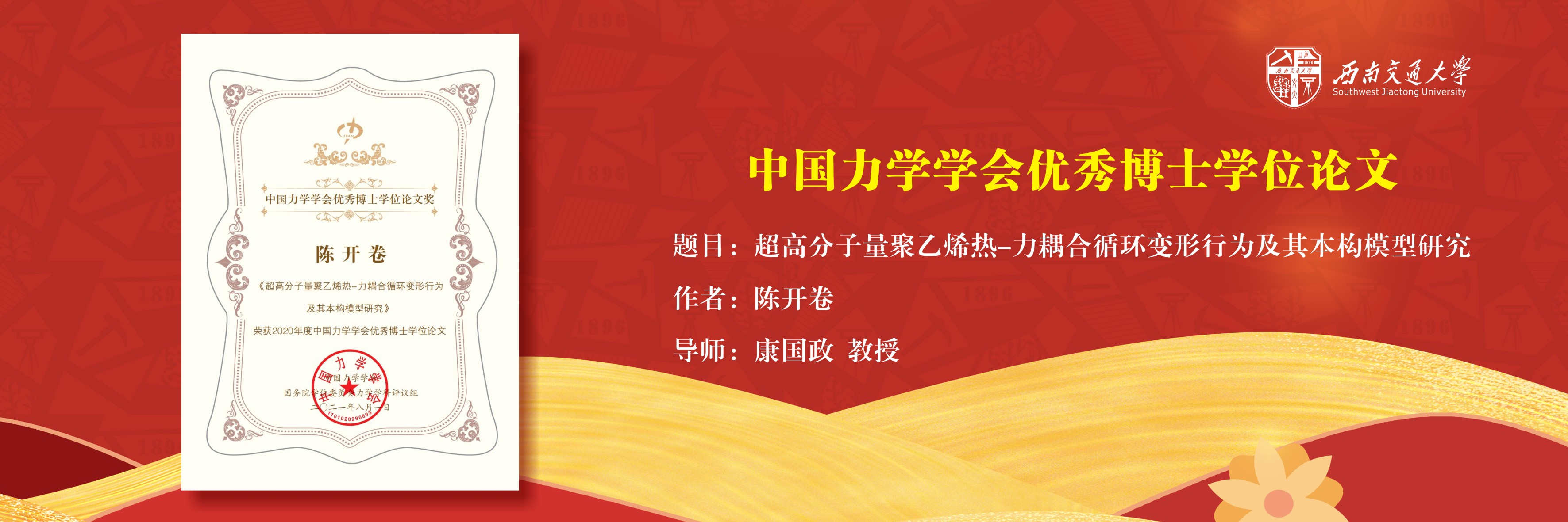 公司新闻网站链接:https://news.swjtu.edu.cn/shownews-22836.shtml为推动中国力学学科领域的科技进步,促进高层次创造性青年人才的培养工作,中国力学学会和国务院学位委员会力学学科评议组共同设立了“中国力学优秀博士学位论文”奖励。评选工作每年进行一次,遵循“科学公正、注重创新、严格筛选、宁缺毋滥”的原则进行。本次中国力学学会优秀博士学位论文评选是中国力学学会和国务院学位委员会力学学科评议组共同设立“...