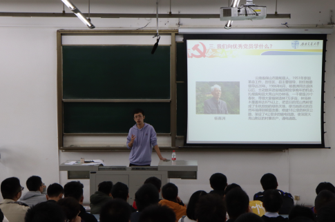 接着,胡持老师通过杨善洲、郭明义等优秀的共产党员光荣事迹,展现了党员是如何将“为人民服务”宗旨践行到实际生活中,同时介绍了员工党员先锋模范作用的发挥事例,引发了同学们对“我们应该向共产党员学习什么”问题的思考。