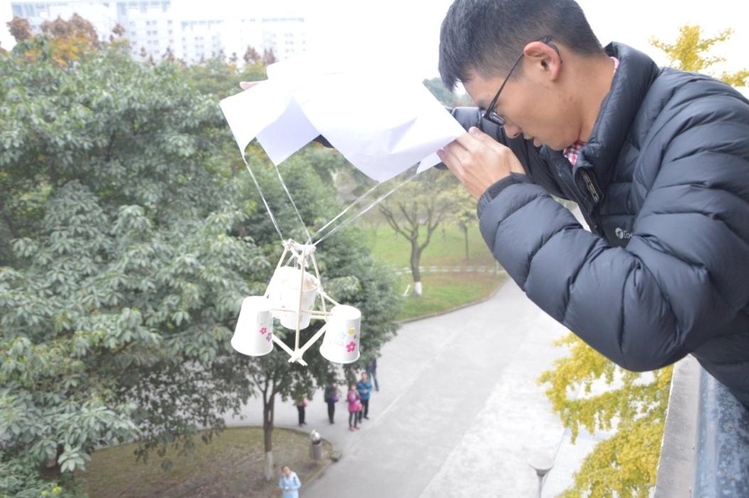 这次初赛提供材料有一次性纸杯4个、A4纸30张、一次性筷子10双、气球2个、胶水1瓶、透明胶1个,选手需在完成的装置中装上鸡蛋,从2教三楼让其自由落下。
