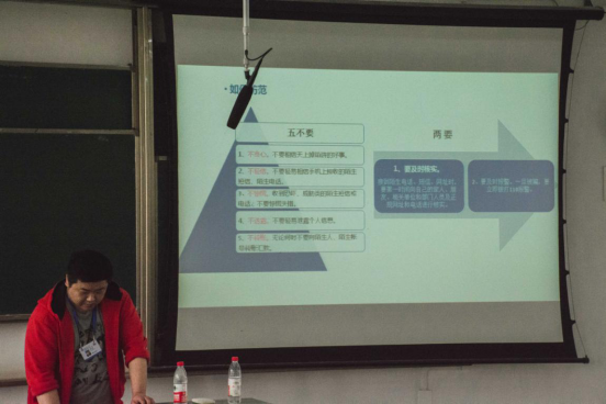 2019年4月4日下午,公司在X2418教室举办了本学期第一次安全知识讲座,内容包括国家安全、治安安全、消防安全、防诈骗、户外及饮食安全、交通安全、自然灾害安全、反恐防暴、防毒防艾以及宿舍安全等。本次讲座由辅导员张容华老师主持,保卫处曾轲老师、李为群老师主讲,2018级全体本科生参与了本次讲座。