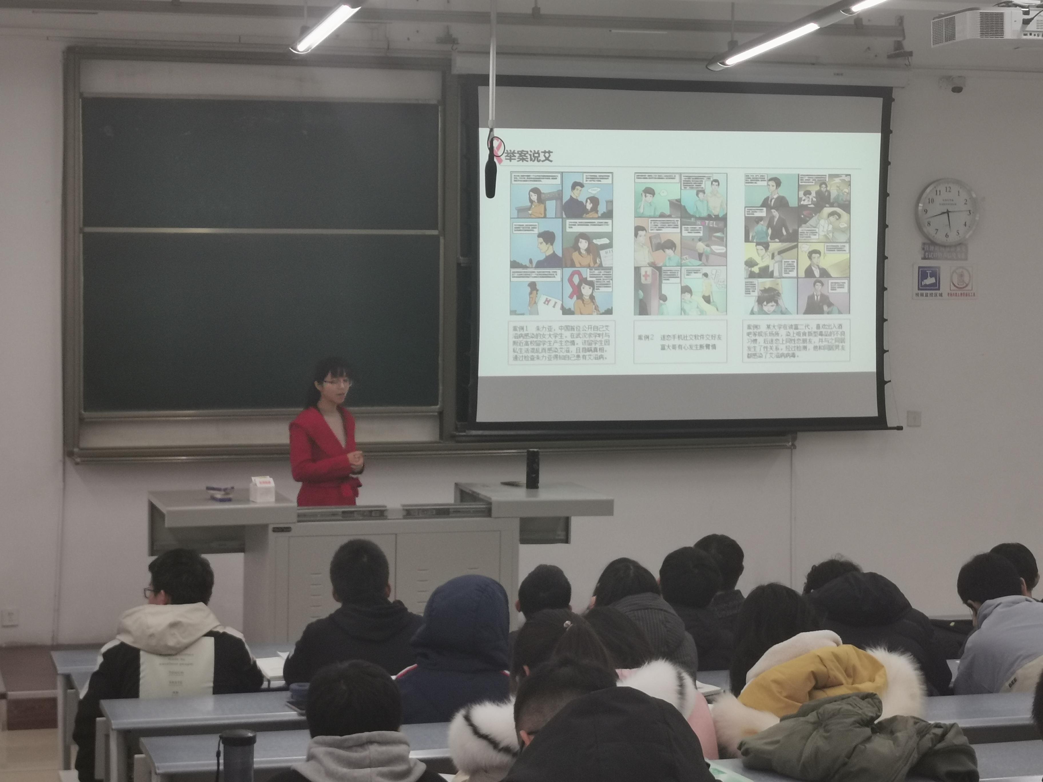 杨婧老师给同学们讲解了什么是艾滋病、艾滋病的感染途径以及预防艾滋病的有效方式,在讲座中,杨老师还通过案例,告诫大家近年来在公司中,员工的艾滋病疫情上升较快,30岁以下青少年人群成为“重灾区”,要求同学们要提高自我保护意识,重视艾滋病的预防。