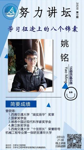 2020年2月5日晚9:00,努力讲坛第三期准时开讲。本期讲坛由来自机械公司的姚铭同学担任主讲人,力学公司本科生党支部牛国浩同学担任主持人,讲授主题为“学习征途上的八个锦囊”。