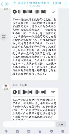 姚铭同学首先介绍了自己名字的来历,再用班级的例子说明良好的学习氛围十分重要。他认为,学习需要用合适恰当的方法。我们在日常学习中要多和同学、老师交流,对知识点反复巩固,善于使用笔记和教辅来解决作业难题。姚铭同学以自己大学三年的求学之路为例子,结合亲身经历从多个角度讲解了他的学习心得。