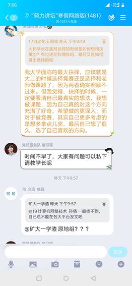 2020年2月10日晚9:00,“竢实扬华”奖章获得者,信息公司16级保研排名第一的唐大伟同学准时开讲,力学公司本科生党支部褚弓瑶同学担任主持人,讲授主题为“农村娃的追光梦”。