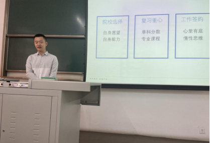 然后,李恒达分享了自己考研本校的历程,他详细介绍了班级同学的去向、自己考研原因、考研院校选择、复习的心得等,让同学们了解考研的准备过程。
