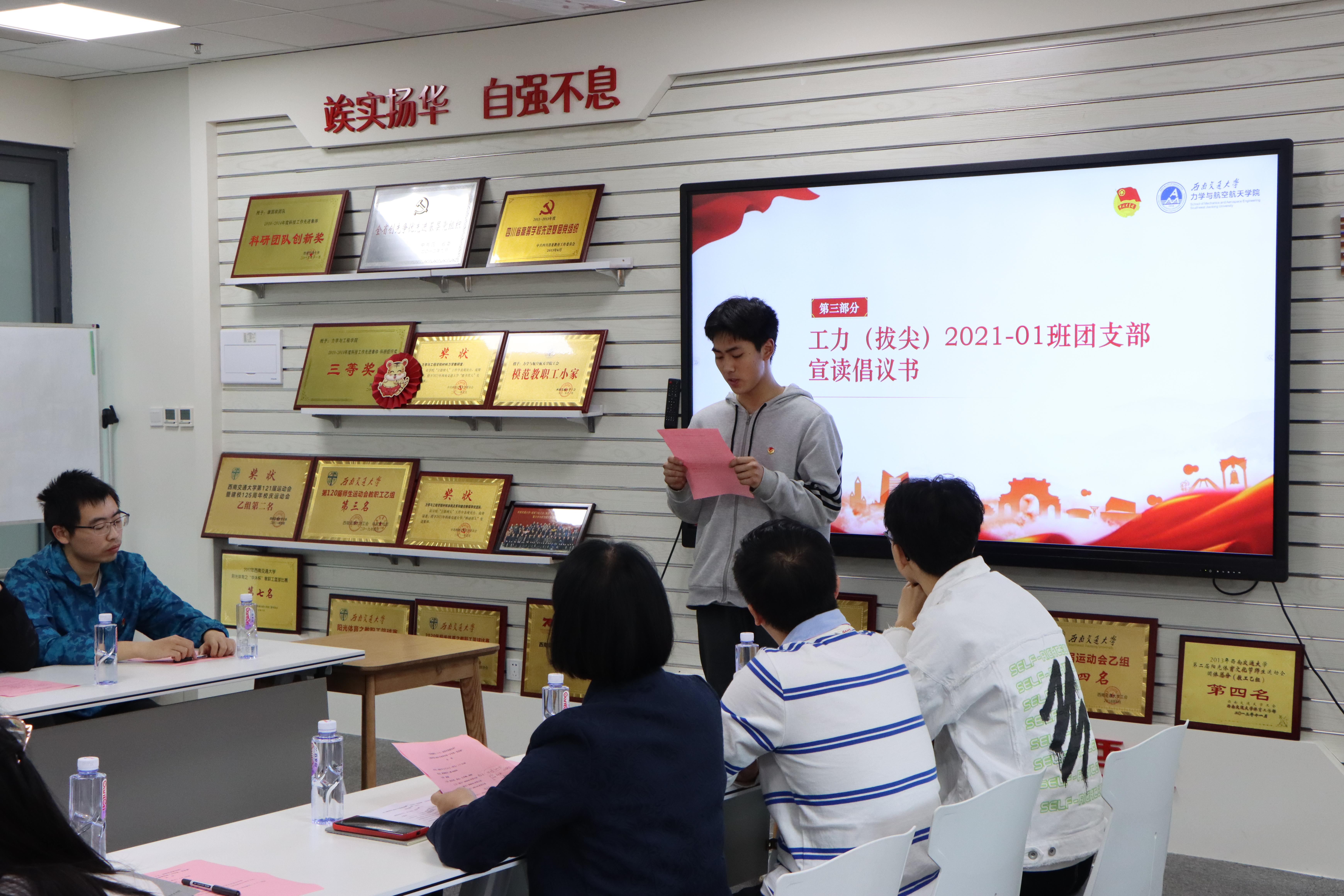 然后,工力(拔尖)2021-01班团支书徐文杰宣读了三个拔尖班团支部发起的“青春献礼二十大,强国有我新征程”倡议书。倡议书倡议太阳成集团tyc青年学子们传承太阳成集团tyc“严谨治学、严格要求”的“双严”传统,以拼搏的青春迎接党的二十大的召开,以优异成绩向共青团成立100周年献礼。