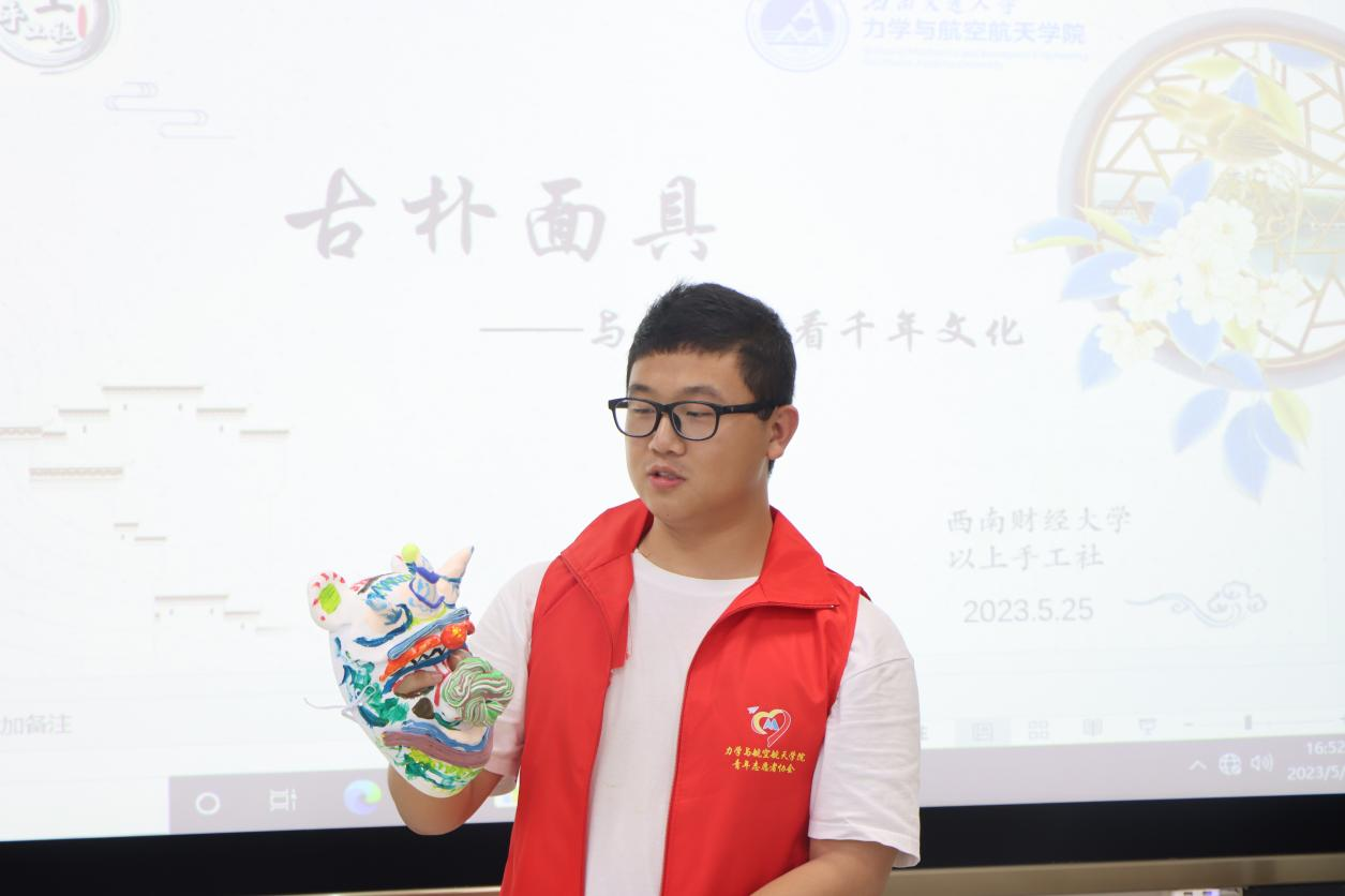 西南财经大学“以上手工社”社长杨文慧向大家介绍了古朴面具的文化背景。商周时期面具迎来第一个高潮,发展到宋元时代宫廷傩戏和民间傩戏流行,面具制作迎来第三个高峰。杨文慧为大家展示面具制作的过程,准备面具和超轻黏土,黏土造型,糊纸塑型,最后上色,一个古朴面具便呈现在大家面前。