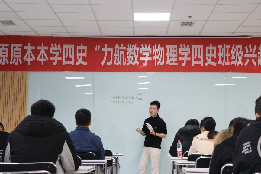 12月10日下午,由力航、数学、物理公司联合开展的“原原本本学四史”班级兴趣小组擂台赛第五场暨颁奖仪式在X30456教室举行。数学公司党委副书记黄祥、物理公司党委副书记郭剑、公司党委副书记孔祥彬和三个公司辅导员老师、员工代表参加了本次活动。活动数学公司邱君捷老师主持。