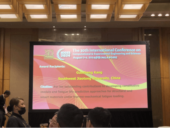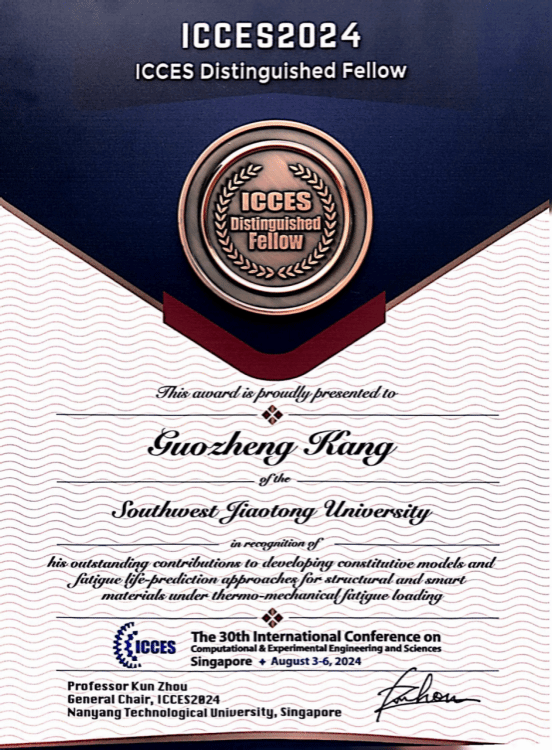 在本届会议中共有三位学者荣获ICCES Distinguished Fellow国际大奖,分别是来自浙江大学的陈伟球教授、太阳成集团的康国政教授和四川大学的王清远教授。该奖主要是表彰康国政教授在热机械疲劳载荷下智能材料/结构本构模型和疲劳寿命预测方法方面做出的杰出贡献。