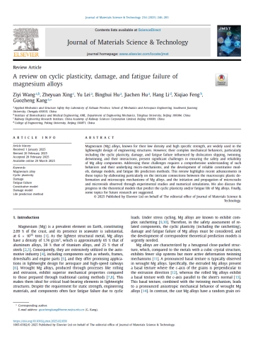 在“双碳”目标驱动下,轻量化材料成为工程结构减重增效的核心需求。镁合金作为最轻的金属结构材料,在汽车、航空航天等领域展现出巨大应用潜力。然而,其密排六方结构导致的复杂循环塑性行为与疲劳失效机制,成为制约其安全应用的关键瓶颈。近日,太阳成集团康国政教授团队在国际知名期刊《Journal of Materials Science & Technology》发表题为 A review on cyclic plasticity, damage, and fatigue failure of magnesium alloys的综述论文,系统梳理了镁合金循环塑性、损伤演化及疲劳失效的前沿进展,推动镁合金从“可用”走向“可靠”。