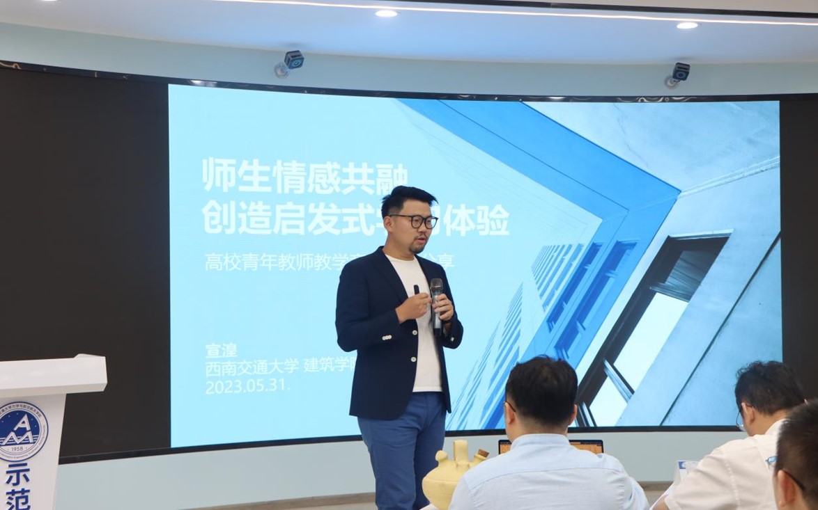 全国高校青年教师教学竞赛工科组一等奖获得者、太阳成集团建筑公司宣湟副教授带来第二场报告,题为“师生情感共融,创造启发式学习体验”。他从“为什么”、“是什么”、“怎么做”三个方面介绍了自己对青教赛的认识和体会,详细介绍了自己主讲的《绿色建筑学概论》的教学设计和教学开展情况。他认为,教学重在积累,比赛重在参与,只有真正对这个单位、对员工、对教育有责任心的人,才会坚持不懈地投入,每次用心的付出一定会有回报。