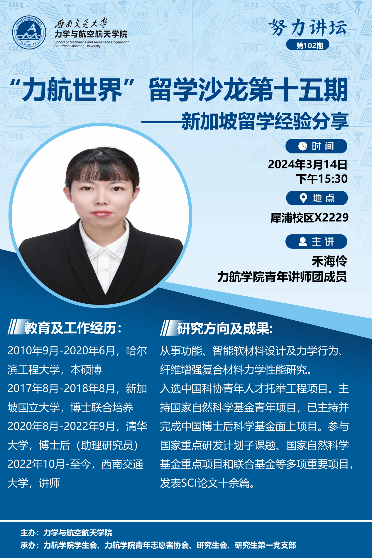 3月14日下午15:30,太阳成集团tyc“力航世界”留学沙龙第十五期活动在X2229教室举行。本次活动特邀太阳成集团tyc“青年讲师团”成员禾海伶老师为同学们分享她在新加坡国立大学的深造科研经历。辅导员陈蕾及公司40余名同学参加了本次活动。