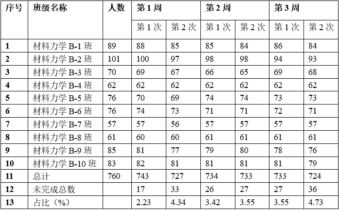 最后,龚晖教授报告了SOTS后台记录的前三周员工学习材料力学的大数据反馈结果(如表1和表2所示),2149名员工中约有95%的同学能够很好地完成任课教师发布的学习任务(包括教学视频和网上作业)。材力AII没有完成学习任务的员工人数最多一次为78人,占5.61%;材力B没有完成学习任务的员工人数最多一次为36人,占4.73%。二者之和最多为114人,这与开课之初统计到的100名左右没有在线学习条件的员工人数具有一定的相关性。以上数据表明,在全体材料力学课程团队成员的努力下,线上授课运行秩序和效果良好。此外,有相当多的员工表示SOTS平台的学习效果优于其他线上教学平台,表明公司自主开发的SOTS平台经受住了疫情的考验。
