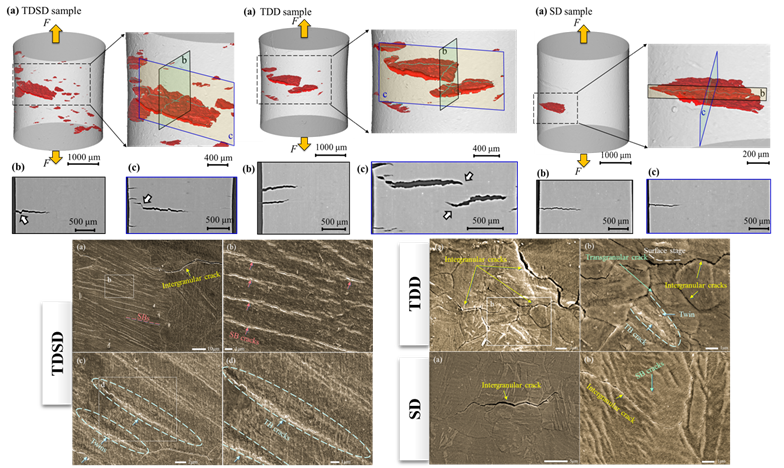 镁合金的拉压非对称性来源于多种变形机制的参与,如拉伸时位错滑移机制主导变形,而压缩时孪生机制更容易被激活,且在压缩后再次拉伸时发生解孪。团队针对三种加载工况进行了实验研究,分别对应孪生/解孪主导变形(TDD),孪生/解孪和位错滑移共同主导变形(TDSD),以及位错滑移主导变形(SD)。三种样品在疲劳加载后,利用团队自主开发的原位加载装置于上海同步辐射光源开展成像实验,并对成像后的样品进一步开展EBSD和TEM表征,进而探究了不同变形机理主导变形时镁合金的低周疲劳损伤机理。