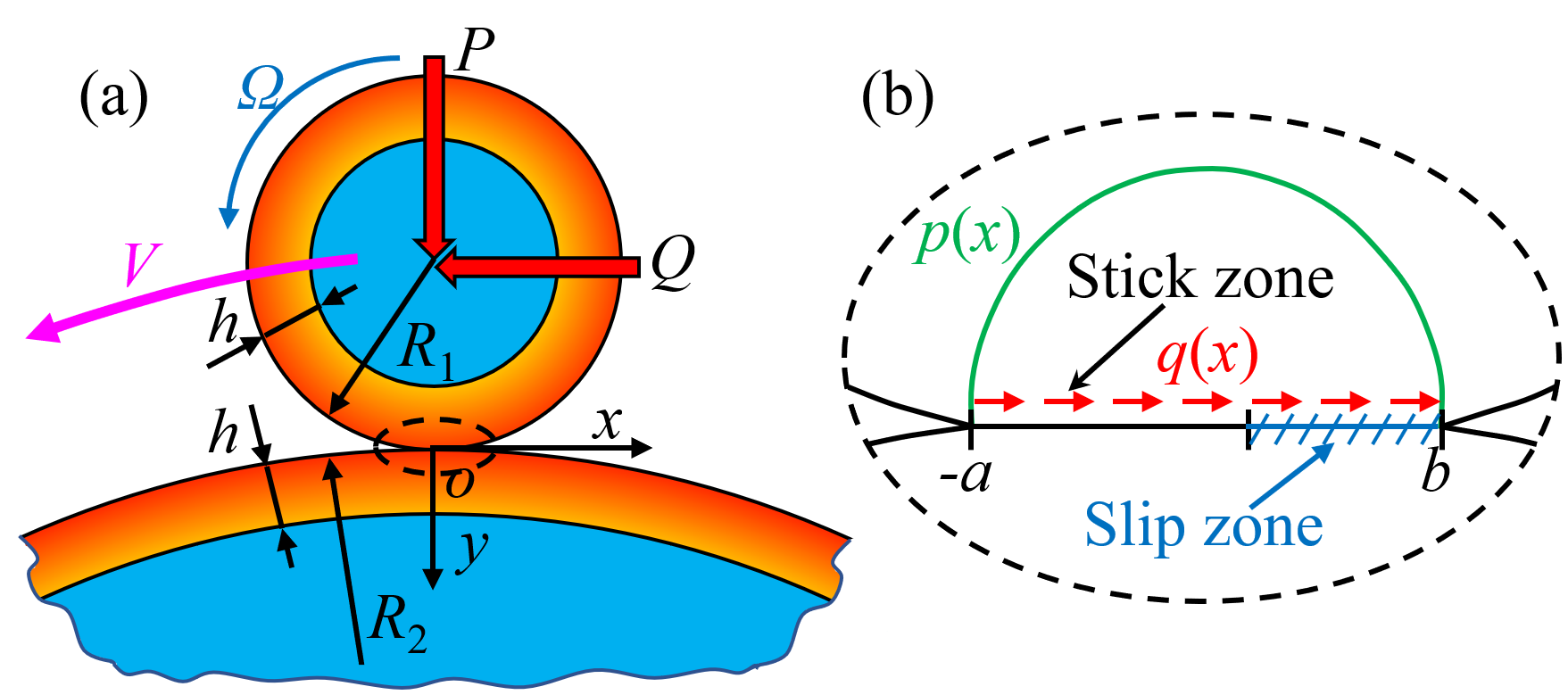图1接触示意图:P和Q分别表示法向和切向载荷,R1和R2分别表示上下圆柱的半径,h、V和Ω分别表示功能梯度涂层厚度、上圆柱的滚动速率以及角速率;p和q分别表示接触斑内的法向接触压力和表面切应力