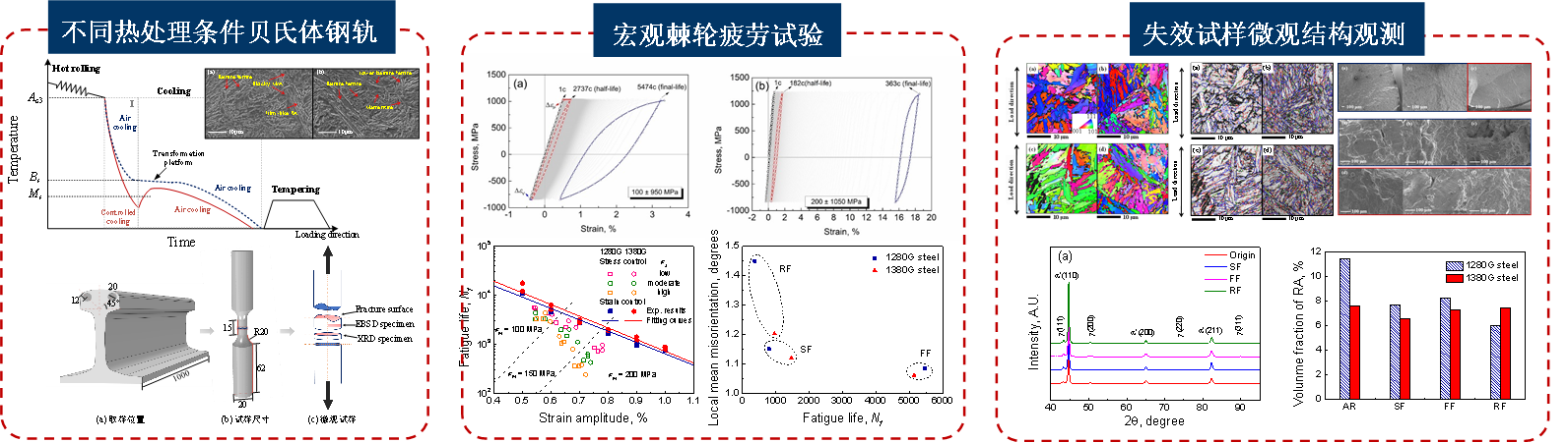 无碳化贝氏体钢轨在滚动接触疲劳载荷作用下多相组织发生动态演变,使得其疲劳损伤机理异常复杂,成为目前抗疲劳设计的关键科学难题。鉴于此,太阳成集团阚前华教授课题组针对两种不同热处理条件下的无碳化物贝氏钢轨钢开展了应变疲劳和应力疲劳试验,分别从宏、微观层面研究了微结构和残余奥氏体对棘轮疲劳交互作用的影响。结果表明无碳化物贝氏呈现出非饱和的应变幅相关的循环软化特性,稳定位错子结构的形成和块状残余奥氏体的转变促进了棘轮变形的演化。