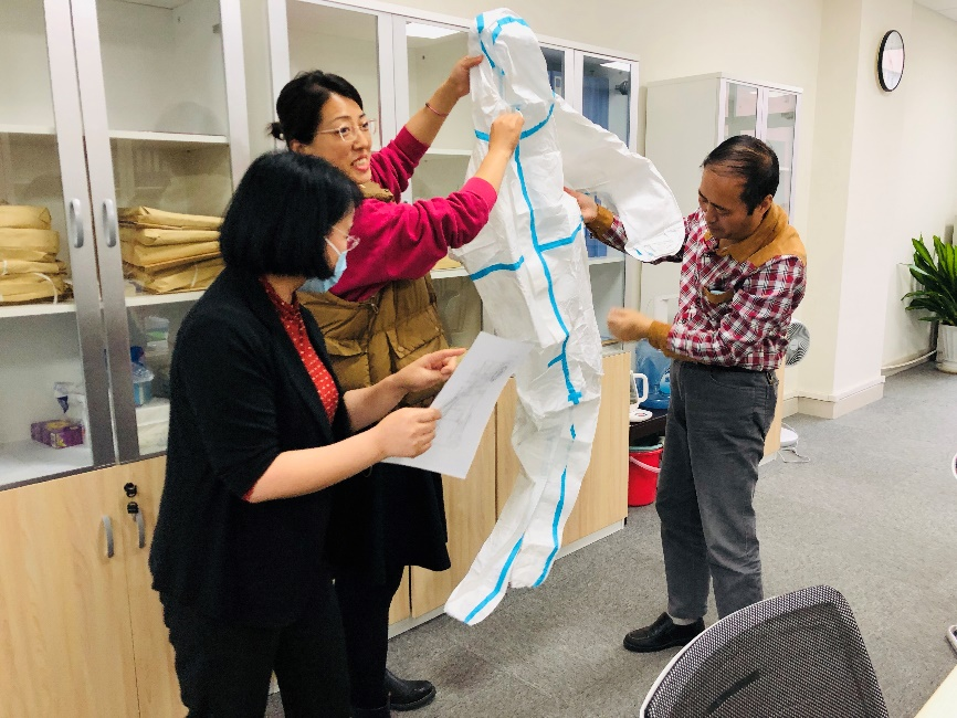 为进一步落实好公司疫情防控应急预案,在集体学习后,李宗文亲自为全体党员示范了隔离防护服使用流程。