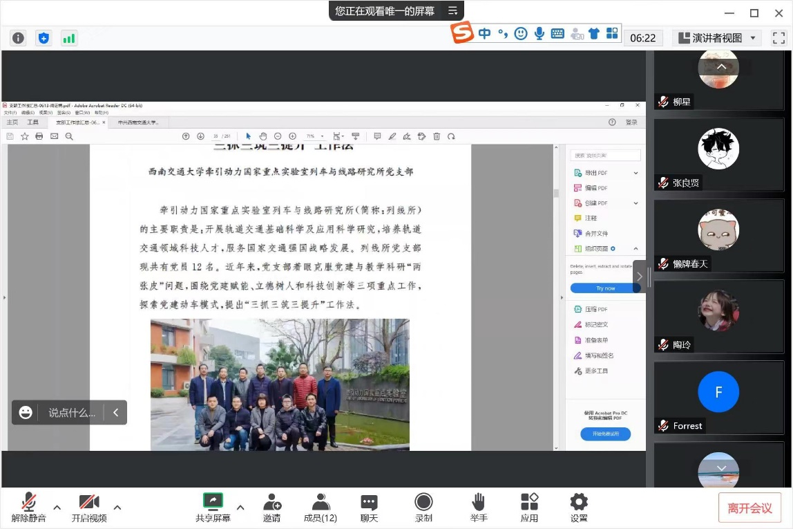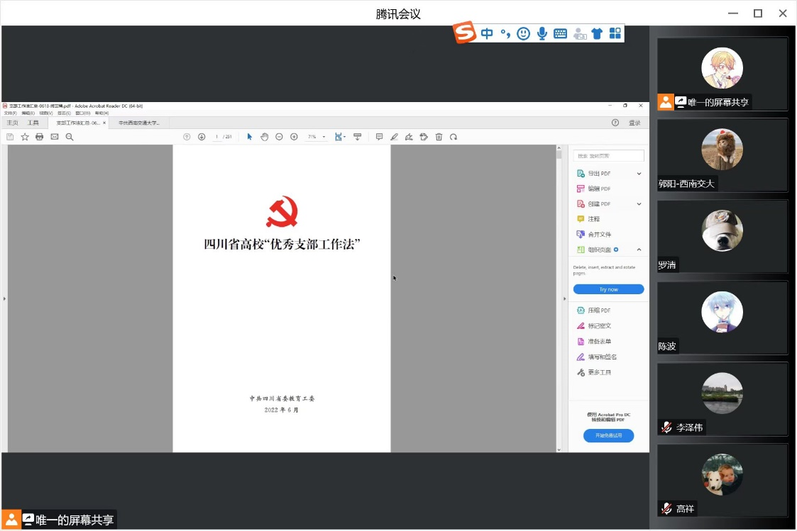 9月23日上午,公司研究生第二党支部开展线上专题学习活动,学习内容为《四川省高校“优秀支部工作法”》部分节选内容,学习活动由支部书记杨宇康同志主持。