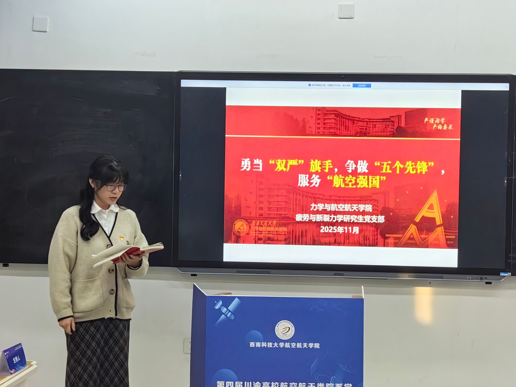 疲劳与断裂力学研究生党支部书记胡冰晖在党支部建设分论坛中做了《勇当“双严”旗手,争做“五个先锋”,服务“航空强国”》报告,全面介绍了以“五个先锋”为核心的支部建设经验。