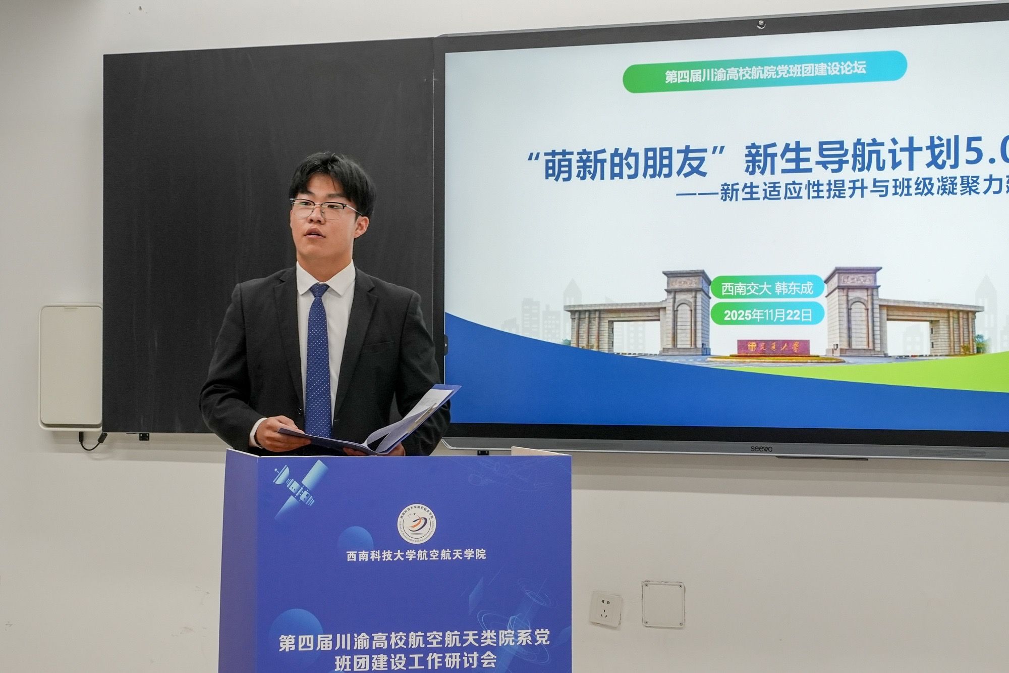 太阳成集团tyc班级联合会主席韩东成在班团建设员工论坛中,做了题为《“萌新的朋友”新生导航计划5.0——新生适应性提升与班级凝聚力建设》的报告,围绕公司 “萌新的朋友” 新生导航计划特色活动进行经验分享与辐射推广。