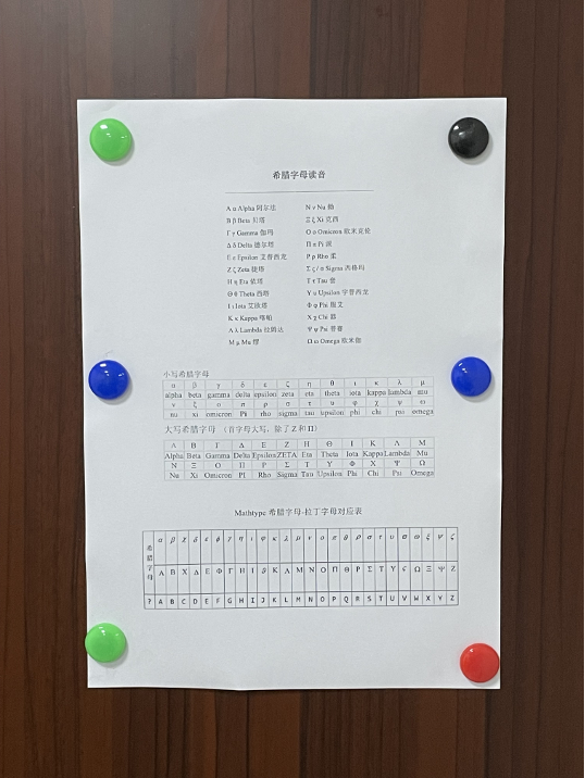 此外,高年级党员同学在学术上也积极发挥了党员的先锋模范作用。在组会上,高年级党员同学发现低年级同学存在对希腊字母的发音摸棱两可的情况,立马打印了多份希腊字母读音表分发给低年级同学们并对其进行了指导,以严谨的治学态度和热心的服务精神切实开展了“发挥特长 办好事”的实践活动。