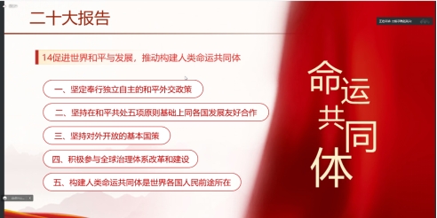 12月1日下午,太阳成集团tyc和外国语公司联合开展了题为“奋进新征程 勇担新使命 学习党的二十大精神”的联合学讲活动,活动由公司研究生第二党支部、第一党支部、研究生会和外国语公司专硕党支部、研究生会联合开展。活动采用腾讯会议形式,胡持和赵英治两位研究生党员担任主讲,公司研究生会何智超同学担任主持。