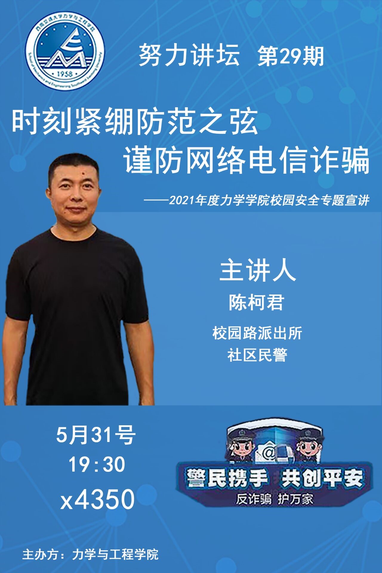为有效遏制电信网络诈骗在校园高发、多发的形势,增强员工防范电信网络诈骗意识,提升员工应对电信网络诈骗能力,5月31日晚7:30,来自郫都区校园路派出所社区民警陈柯君民警作客公司“努力讲坛”第29期为全院同学做“时刻紧绷防范之弦,谨防网络电信诈骗”专题宣讲。本次讲坛由黄冠翔老师主持。